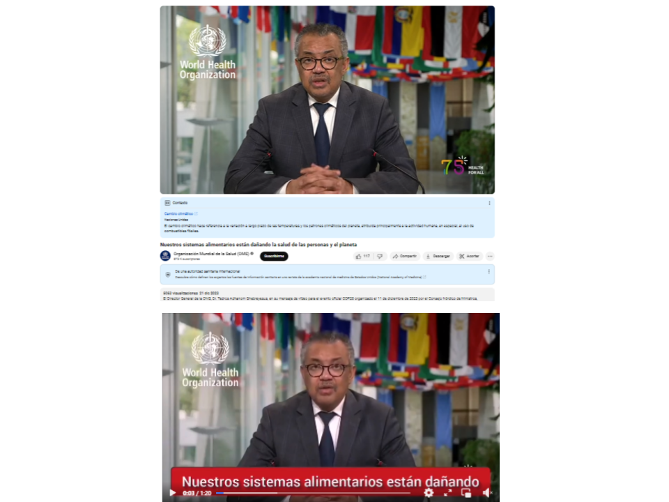 Al hacer una búsqueda en Google con esa frase, encontramos un video en el canal oficial de la OMS en YouTube titulado “Nuestros sistemas alimentarios están dañando la salud de las personas y el planeta”, publicado el 21 de diciembre de 2023. La descripción de la grabación aclara que es el mensaje que Adhanom presentó ante la COP28 (también llamada Cumbre del clima), que se realizó del 30 de noviembre al 12 de diciembre de 2023 en Emiratos Árabes Unidos (EAU).