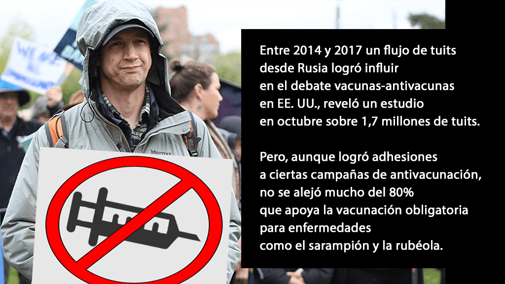 HAY QUE VACUNAR LAS NOTICIAS. La influencia rusa en EEUU llegó hasta los pinchazos. La investigación de Robert Mueller ha seguido revelando fisuras en las plataformas y redes. Entre 2014 y 2017 un flujo de tuits de troles rusos logró influir en el debate vacunas-antivacunas en EEUU, aumentando la división pro-contra, difundiendo noticias falsas y polarizando lo más posible. Eso lo reveló un estudio en octubre sobre 1,7 millones de tuits. Se cree que la campaña logró aumentar ligeramente el porcentaje de quienes se oponen a la vacunación, pero no se alejó mucho del 80% de estadounidenses que apoya la vacunación obligatoria para enfermedades como el sarampión y la rubéola.