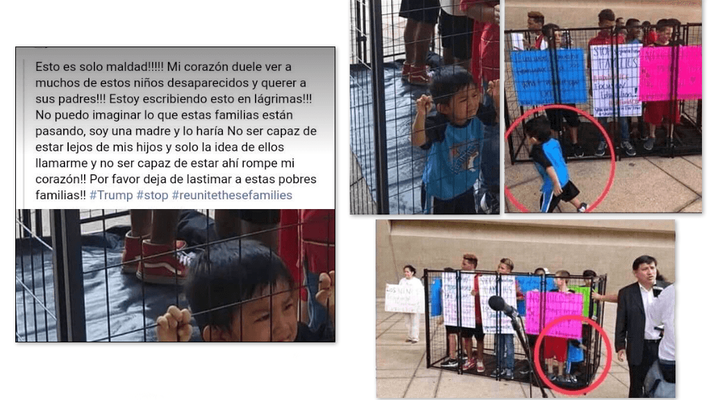 - A finales de junio circuló una foto que causó escándalo: un niño enjaulado, uno de los +2.300 menores separados de sus familias en la frontera texana con México. Se acusó al gobierno de incurrir en acciones barbáricas y fue usada para la agenda demócrata anti-Trump. No obstante, la foto no es lo que parecía. Fue una protesta en Dallas contra los menores separados en las que escenificaron el encierro con unas rejas, pero no cerradas, meramente la parte de adelante, para las fotos. El niño de marras nunca estuvo enjaulado y lloró por alguna razón distinta a estar separado de su madre, quien pronto lo sacó del montaje. Hay más información en este enlace.