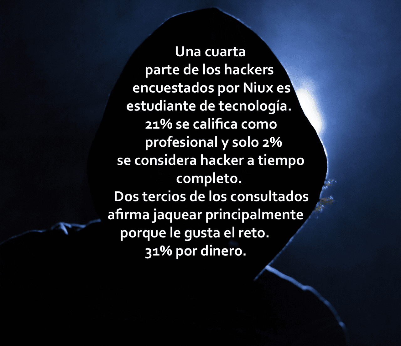 Vale decir, que en la encuesta de Niux, una cuarta parte de los hackers encuestados es estudiante de tecnología, 21% se califica como profesional y solo 2% se considera hacker a tiempo completo.