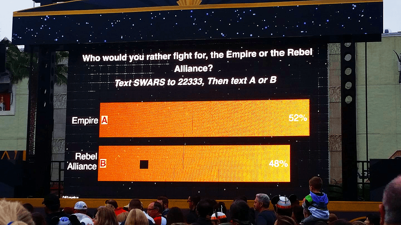 La semana pasada en un parque de Orlando observé algo que me dejó pensando. Durante una escenificación de Star Wars donde ganaron los “buenos”, se le pidió al público que votara vía SMS junto a qué bando preferiría pelear (que es una forma de decir de qué lado estaban). El resultado dio una ventaja ¡al Imperio! de 52% contra 48%.