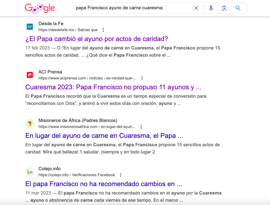 Mediante una búsqueda por palabras clave en Google, en elDetector encontramos varias notas que desmentían que el papa Francisco hubiera hecho tal propuesta, entre ellas una de la Agencia Católica de Informaciones (ACI) y otra de una revista religiosa mexicana, Desde la Fe, ambas publicadas en febrero de 2023.