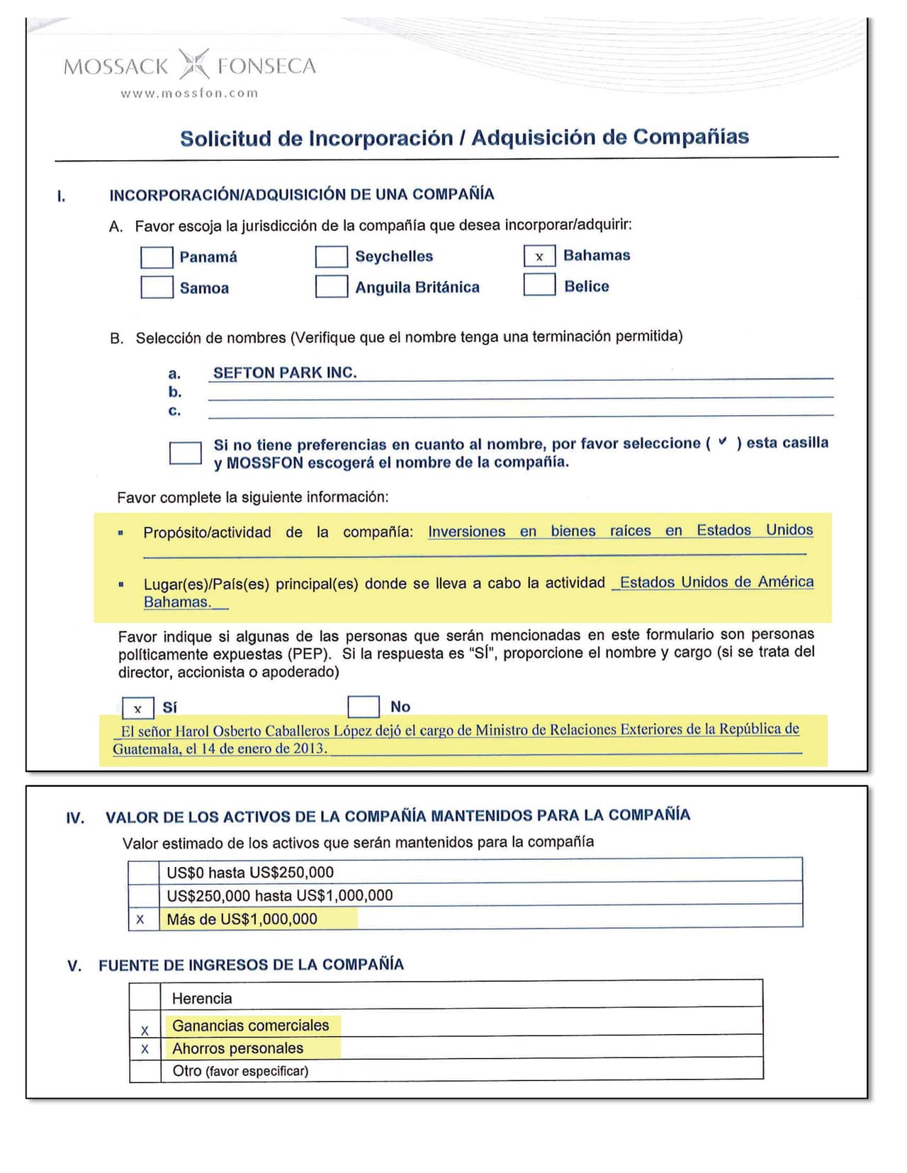 Otro servicio de Mossack Fonseca para Harold Caballeros López que revelan los archivos confidenciales, corresponde a la venta de una sociedad offshore llamada Sefton Park Inc, adquirida en noviembre de 2014, dos años después de haber dejado su cargo como ministro de Relaciones Exteriores de Guatemala.