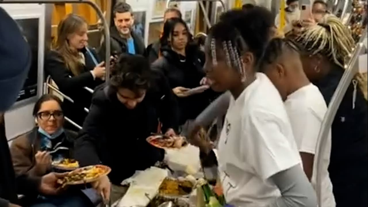 Pasajeros neoyorquinos disfrutaron de una cena por del Día de Acción de Gracias en un vagón del metro