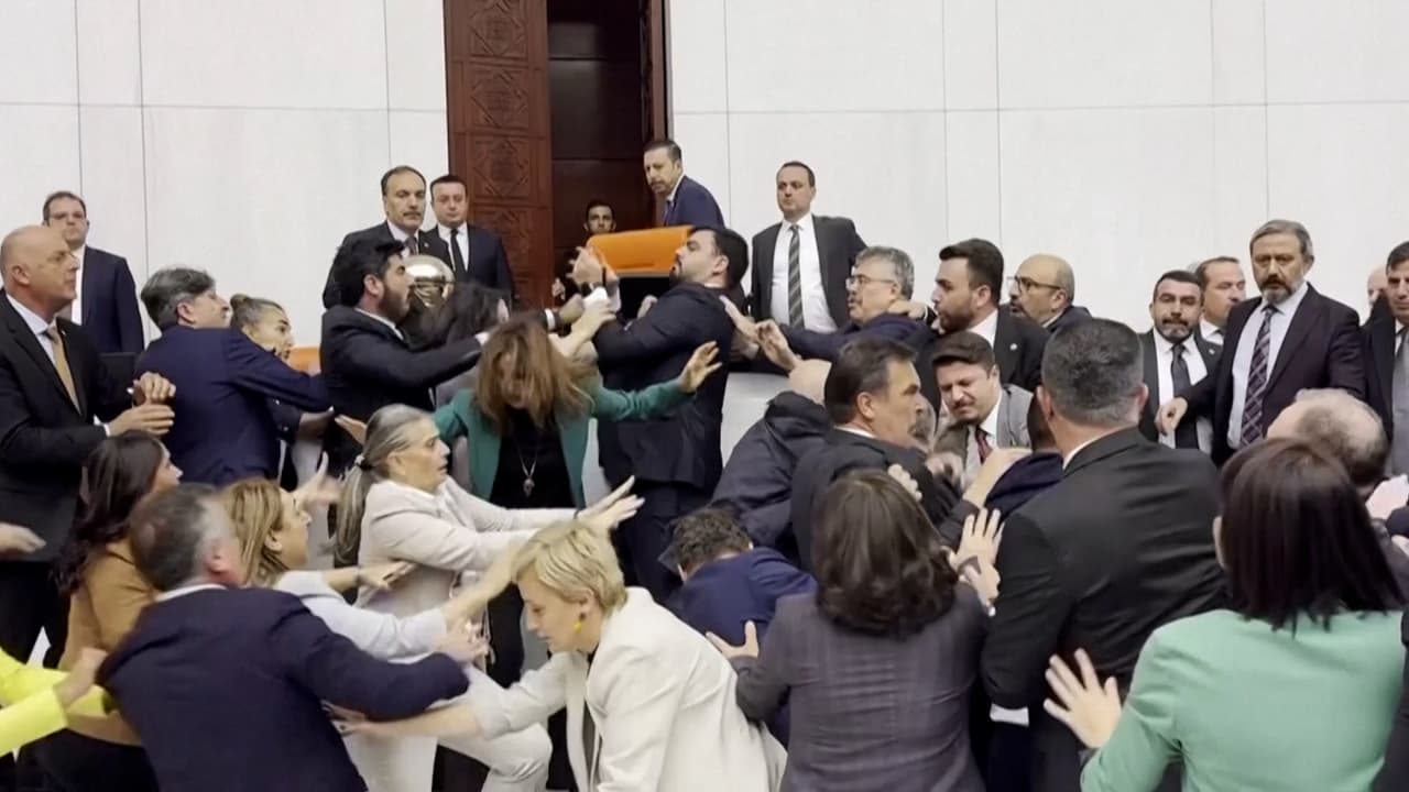 La trifulca multitudinaria comenzó cuando un diputado se acercó al estrado para darle un puñetazo a Ahmet Sik, quien pedía la liberación de un colega encarcelado. Sigue las últimas noticias en Univision.