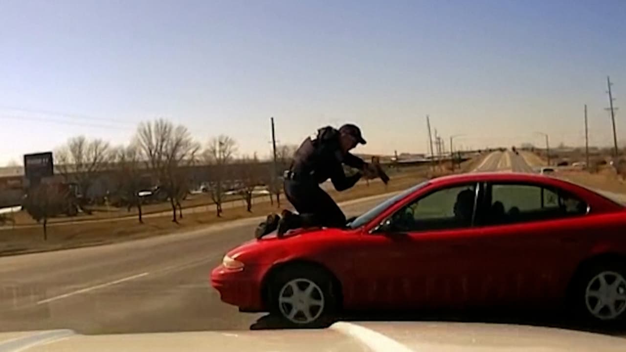 La policía de Iowa publicó el video de una persecución en la que el sospechoso intentó huir de un arresto y condujo con el policía en el cobre de su automóvil hasta que cayó. Más videos en Univision