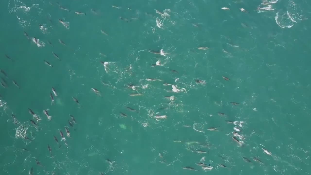 Un dron filmó el nado sincronizado de decenas de delfines en la costa de Ciudad del Cabo, en Sudáfrica.