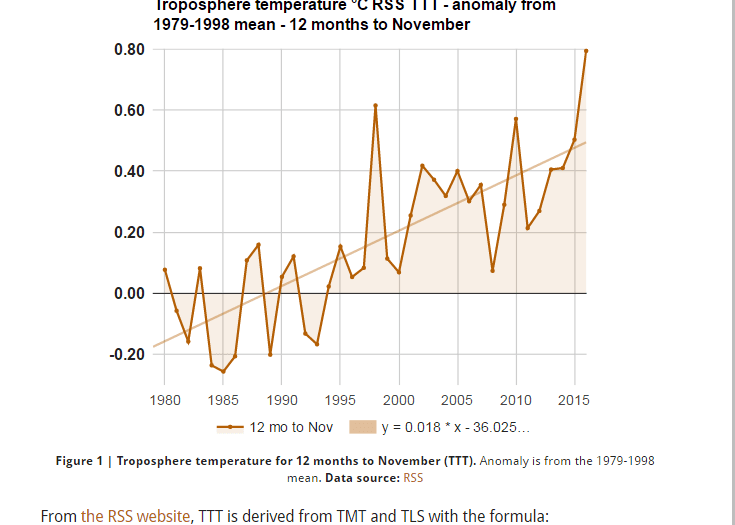 Entonces, si se unen los últimos datos satelitales de la superficie de la tierra y de los océanos se puede ver que en realidad noviembre de 2016 fue el más caliente registrado en general y también en la troposfera, que es la capa de la atmósfera terrestre que está en contacto con la superficie y hasta los 10 kilómetros, aproximadamente.