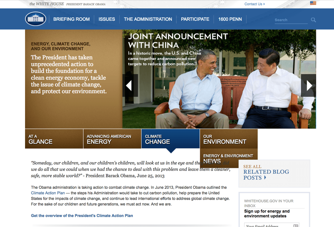 Una búsqueda en el sitio web de la Casa Blanca no da ningún resultado. Las únicas menciones de "cambio climático" fueron páginas archivadas que, después de hacer clic en los enlaces relacionados, conducen a páginas eliminadas. Esta era la página del cambio climático del Presidente Obama:
