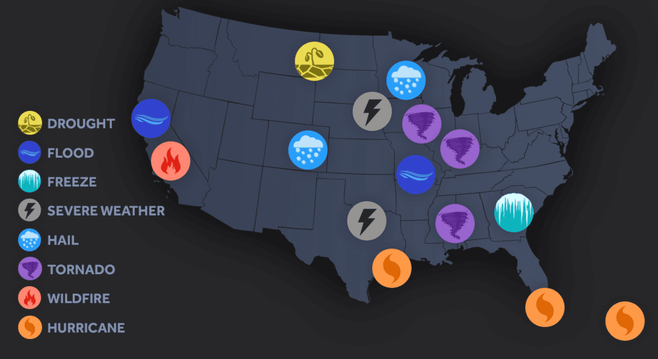Dónde: Las temperaturas bajaron mucho y los cultivos de melocotones, arándanos, fresas y manzanas en varios estados del sureste se congelaron. Si bien las heladas a mediados de marzo no son climatológicamente inusuales en el sudeste. Esta vez, debido a temperaturas inusualmente cálidas durante las semanas anteriores, muchos cultivos estaban floreciendo (más de 3 semanas antes). El daño fue severo, especialmente en Georgia y Carolina del Sur.