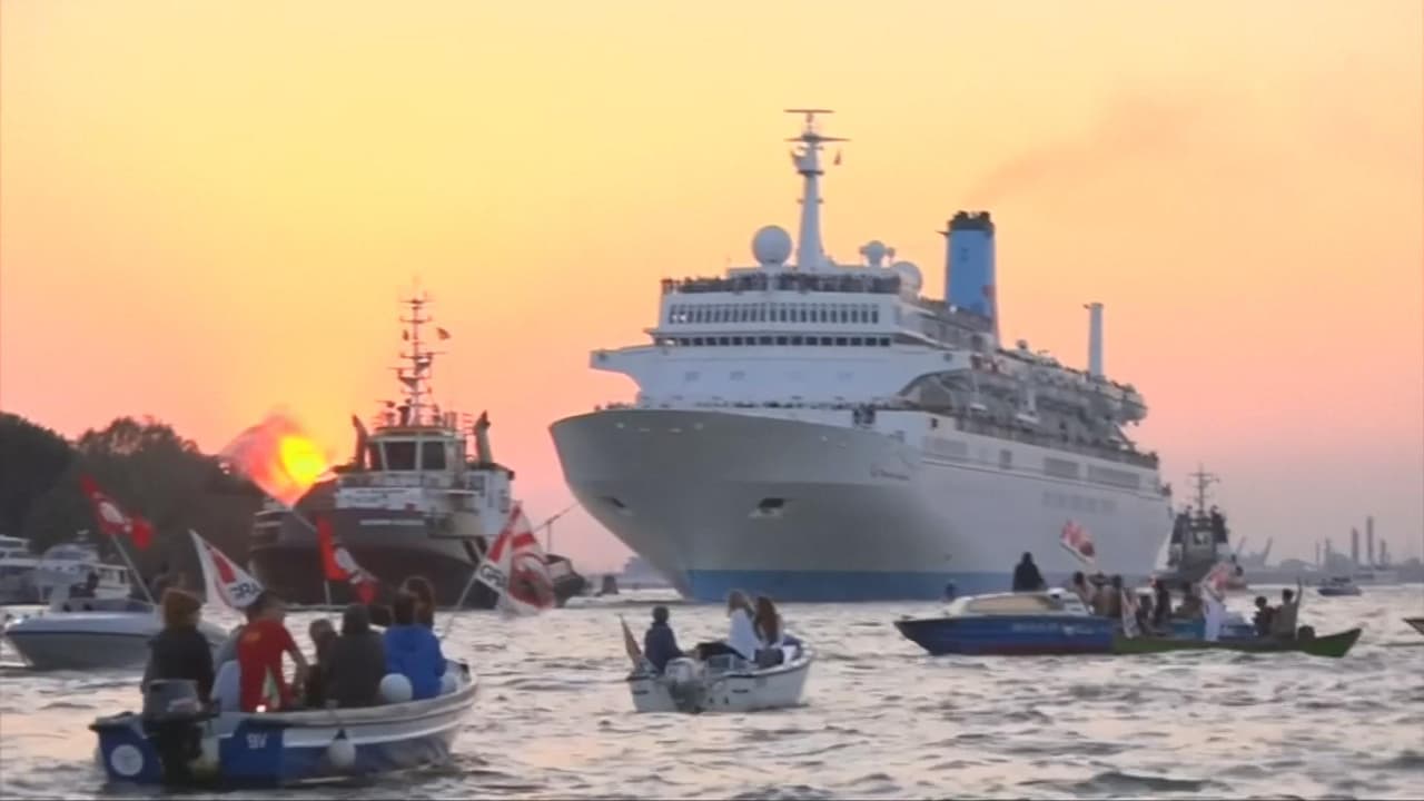 Residentes y ambientalistas protestan en la ciudad turística italiana frente a enormes cruceros autorizados a circular por los canales, por temor a que causen daño a la frágil ciudad.