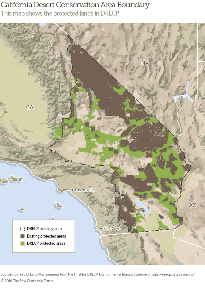 Por su parte, el Pew Charitable Trusts asegura que gracias al Plan de Energía Renovable para la Conservación del Desierto de California (DRECP por sus siglas en inglés) “será posible equilibrar el surgimiento de las energías renovables a la vez que se preservan los hábitats de una vasta franja del desierto de California que incluye Silurian Valley, Mayan Peak y Chuckwalla Bench”. Además, se habla de que este plan prepara a este estado contra la minería en la zona (en el futuro) y regula todas las actividades comerciales en el presente.