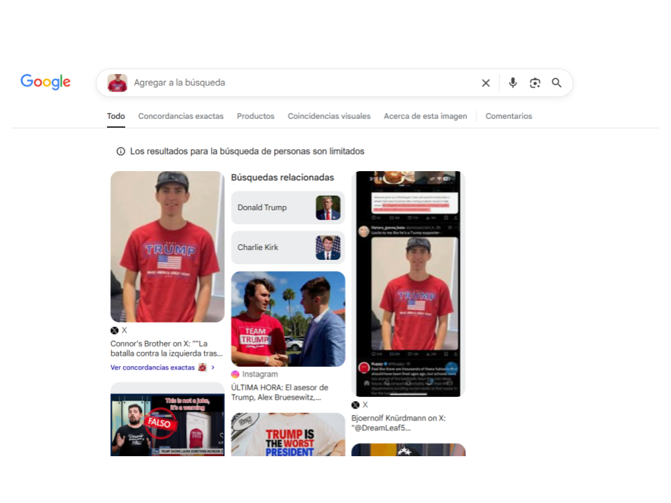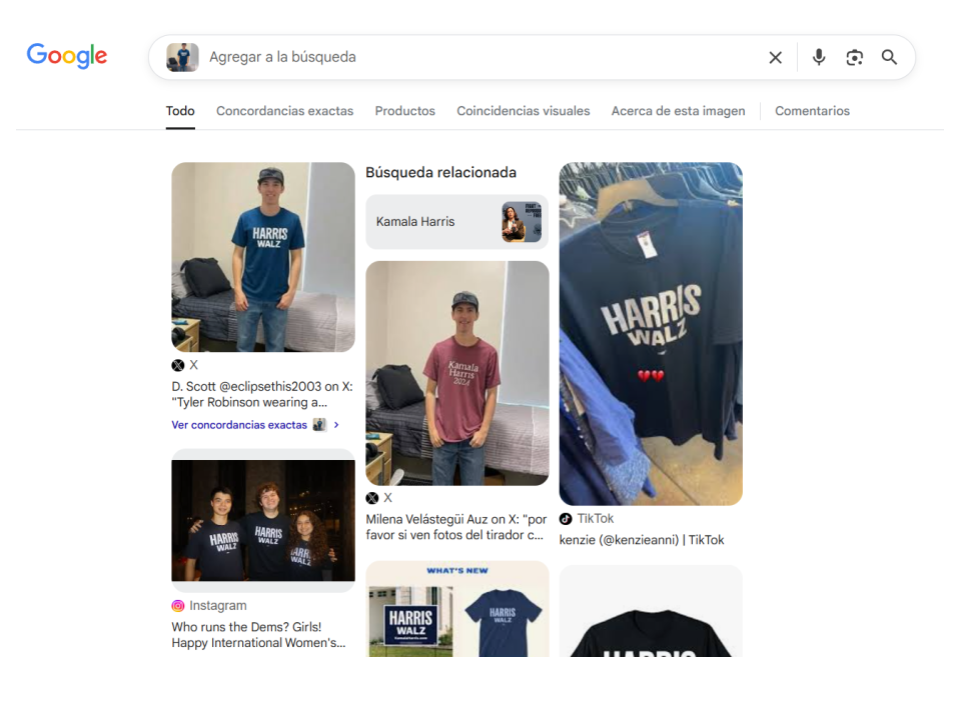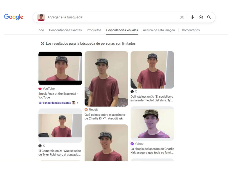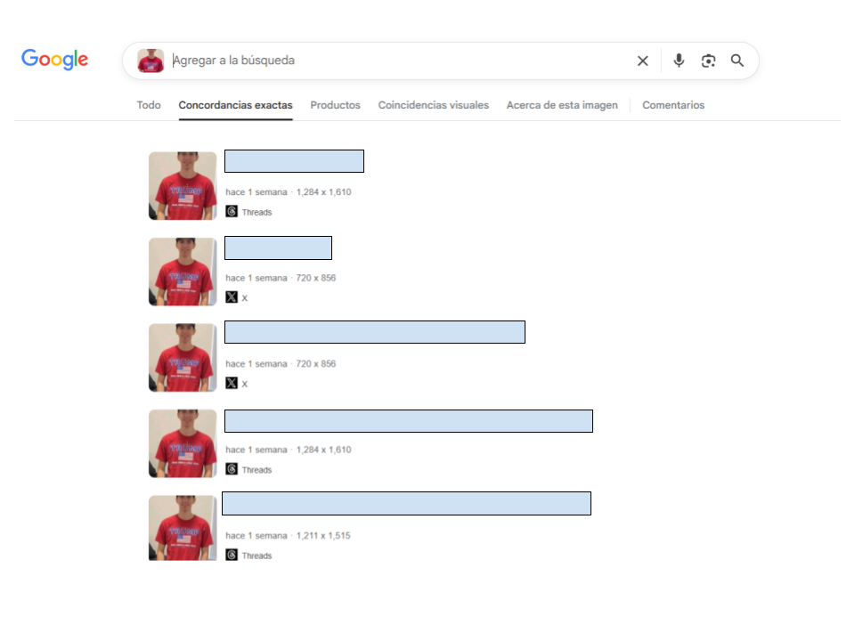 En elDetector hicimos el mismo procedimiento de pasar la fotografía por la búsqueda inversa de imágenes en Google Lens. En las concordancias exactas, hay réplicas de la afirmación falsa en decenas de cuentas en Facebook, X, TikTok e Instagram, pero en las concordancias visuales, la búsqueda arrojó nuevamente la fotografía original de Robinson con playera vinotinto, que fue usada por medios de comunicación para ilustrar notas sobre el caso.