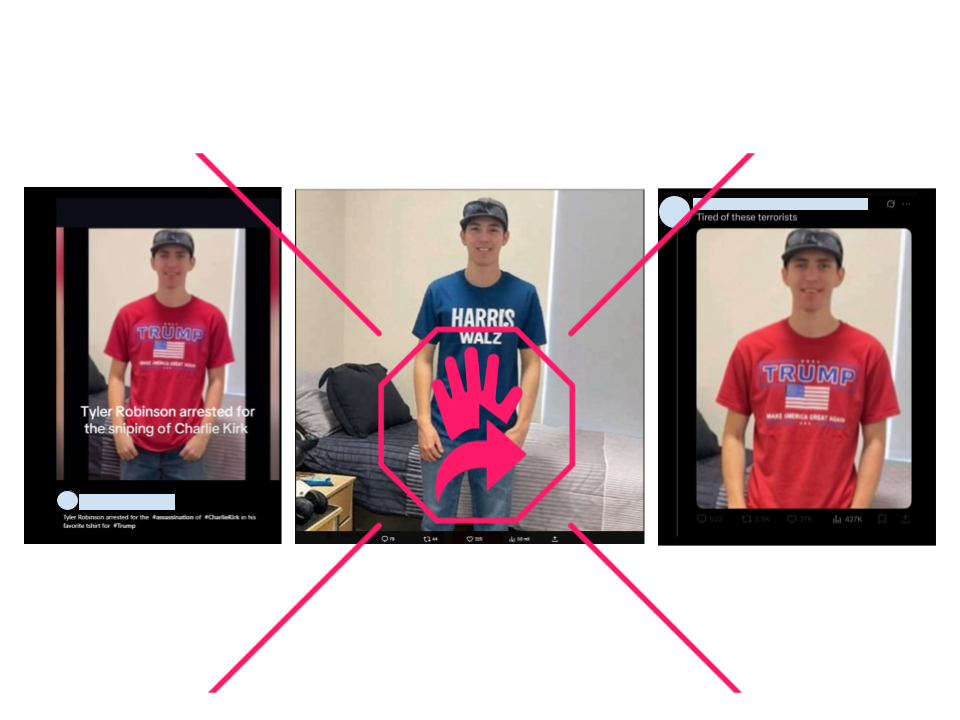En redes sociales se viralizaron dos fotografías de Tyler Robinson, acusado de asesinar al activista conservador Charlie Kirk: en una se le ve supuestamente usando una playera roja con el apellido de Donald Trump y las siglas del movimiento Make America Great Again (MAGA), y en otra con una playera azul con las palabras Harris - Walz, en alusión a la pareja demócrata Kamala Harris y Tim Walz, y a los que venció Trump en las últimas elecciones presidenciales. Ambas son falsas, pues han sido manipuladas digitalmente.