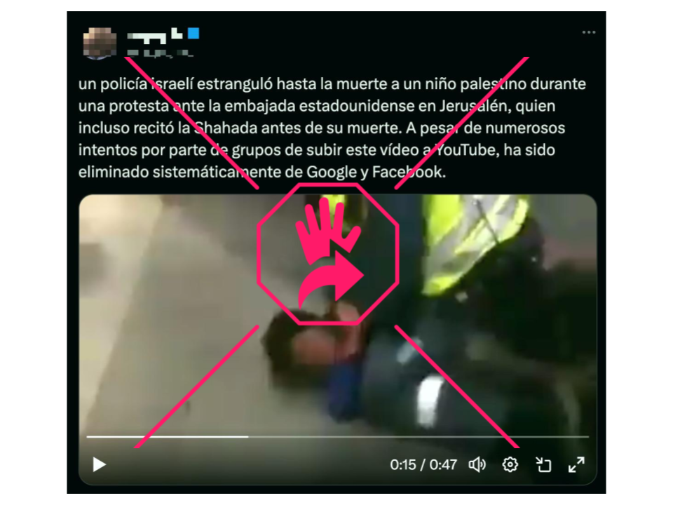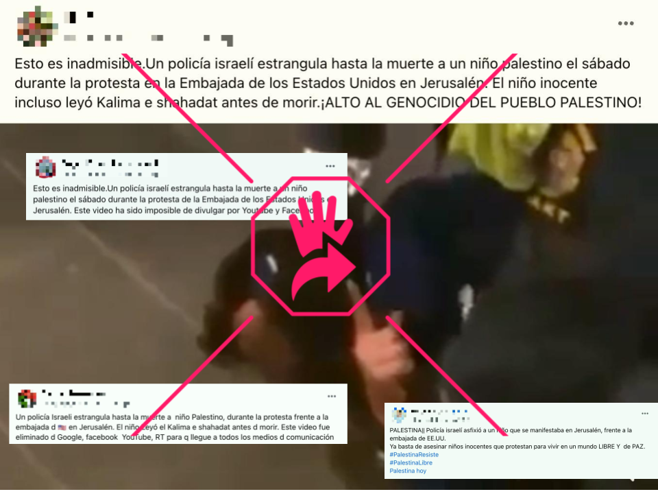 “Un policía israelí estranguló hasta la muerte a un niño palestino durante una protesta ante la embajada estadounidense en Jerusalén, quien incluso recitó la Shahada antes de su muerte. A pesar de numerosos intentos por parte de grupos de subir este video a YouTube, ha sido eliminado sistemáticamente de Google y Facebook”, dice el mensaje que acompaña las imágenes y que también se ha compartido en esa última red social.