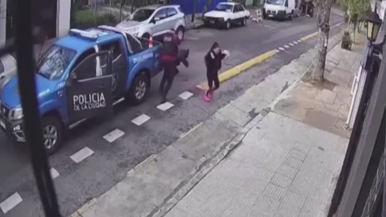 La rápida intervención del uniformado le permitió a la mujer escapar del sujeto que la perseguía. El policía le disparó dos veces al sospechoso antes de detenerlo y la acción quedó grabada en cámaras de seguridad.