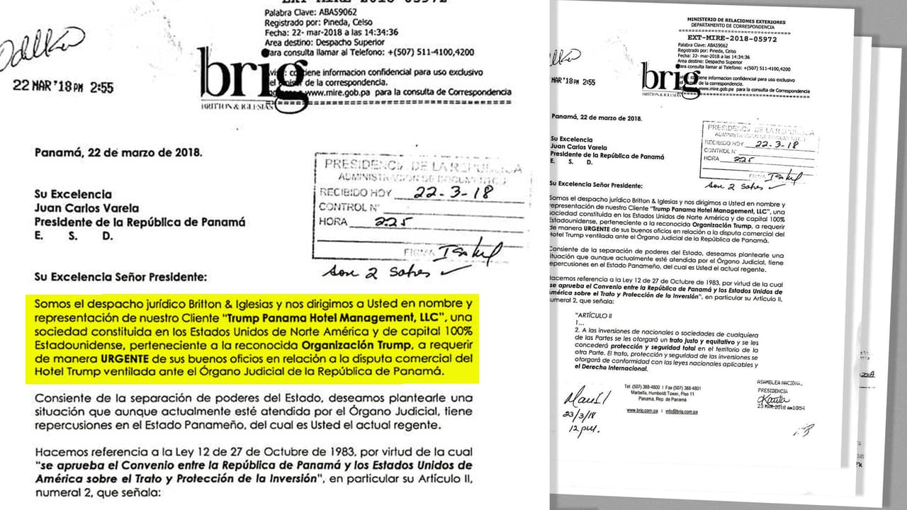 La carta, fechada el 22 de marzo, fue enviada al presidente Juan Carlos Varela por la firma de abogados Britton & Iglesias, quienes representan a la empresa de gestión hotelera de Trump en Panamá, parte de la Organización Trump. La carta fue revelada por primera vez por el diario de Panamá La Prensa este lunes.