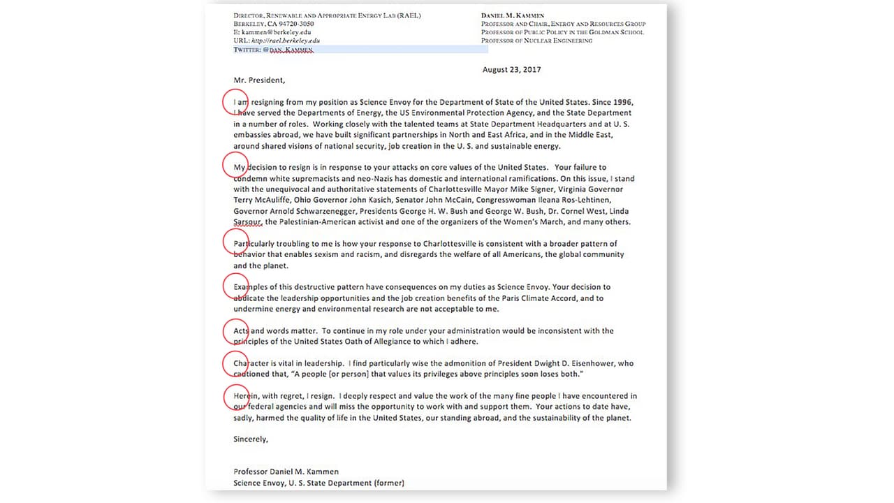 "Mi decisión de renunciar es en respuesta a sus ataques contra valores fundamentales de EEUU", escribió Daniel Kammen, profesor especializado en energía de la Universidad de California en Berkeley, quien es uno de los enviados científicos del programa de ese departamento del gobierno.