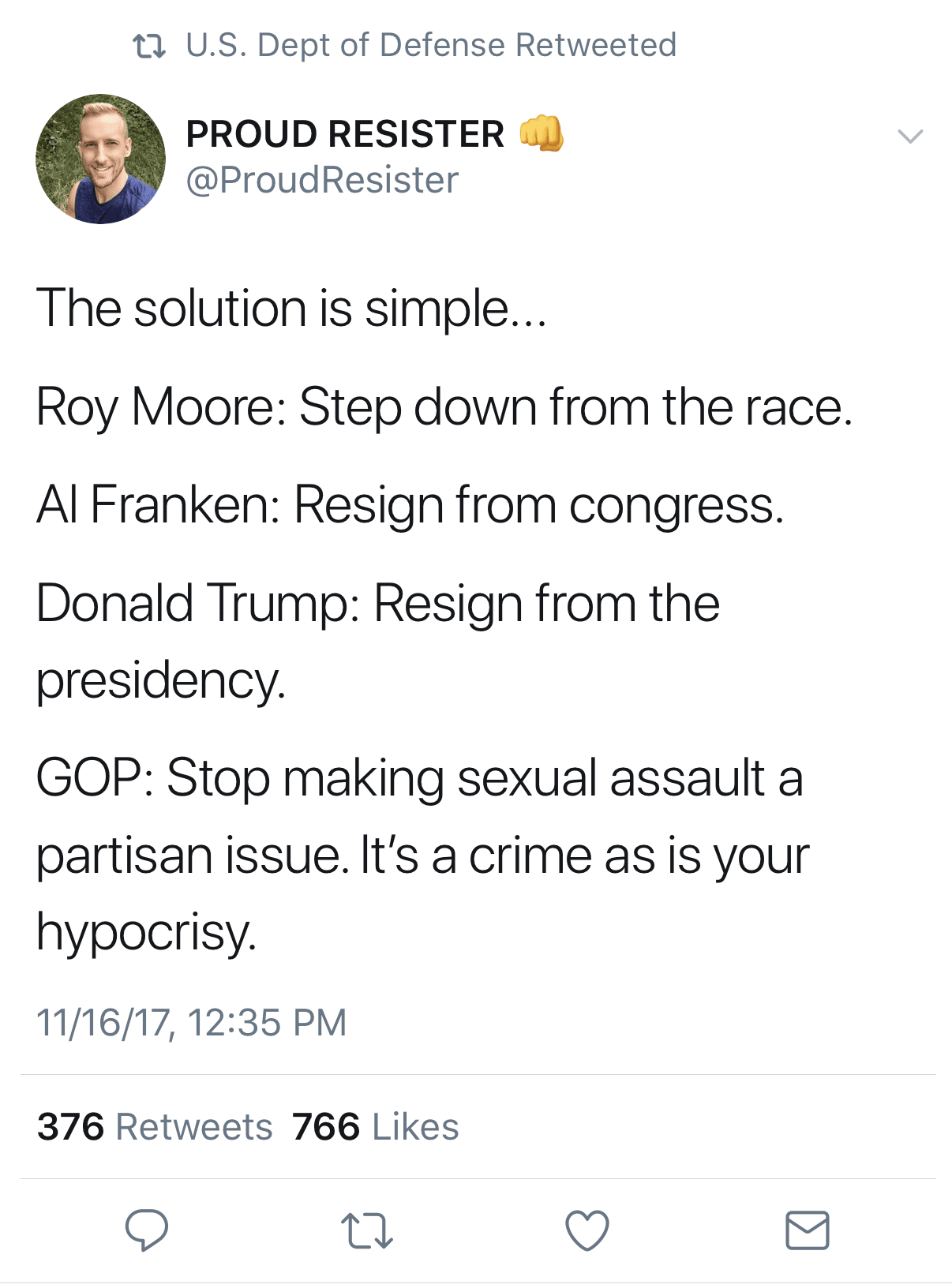 Un usuario de la red social identificado como @proudresister, en referencia a las recientes acusaciones de maltrato sexual tuiteó: "La solución es simple... Roy Moore: Renuncia a la candidatura. Al Franken: Renuncia al congreso". El tuit concluye con "Donald Trump: Renuncia a la presidencia. GOP: Deja de convertir las agresiones sexuales en un asunto partidista. Es un crimen, así como tu hipocresía".