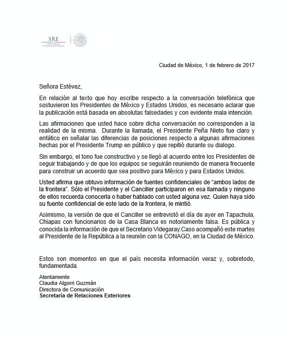 Mientras tanto, en México ya circulaba una versión similar de esta conversación con tono amenazante por parte de Trump. La periodista mexicana Dolia Estévez, quien cubre la información de la Casa Blanca desde Washington, le aseguró al medio de Carmen Aristegui (Aristegui Noticias) que "fue una conversación muy ofensiva donde Trump humilló a Peña Nieto”.