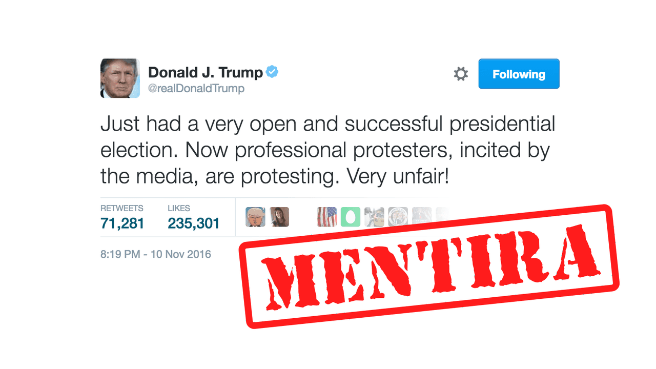 No hay ninguna evidencia para decir que los miles de manifestantes que salieron a las calles en distintas ciudades de Estados Unidos tras la elección fueran pagados por alguna persona o algún grupo. Todo indica que eran manifestaciones legítimas de personas molestas con el resultado. Además que, de ser manifestantes profesionales, no serían instados por los medios de comunicación, por lo que hay una notable incongruencia en el planteamiento.