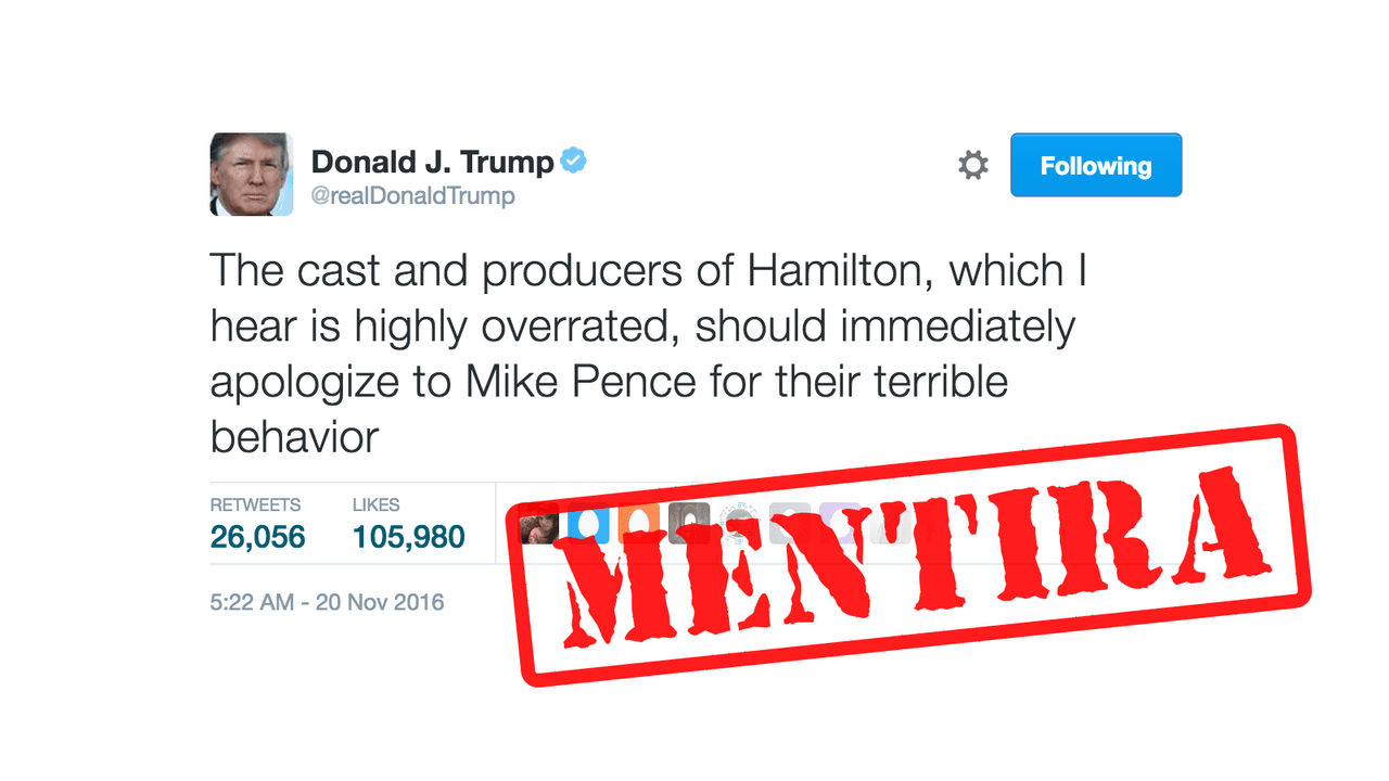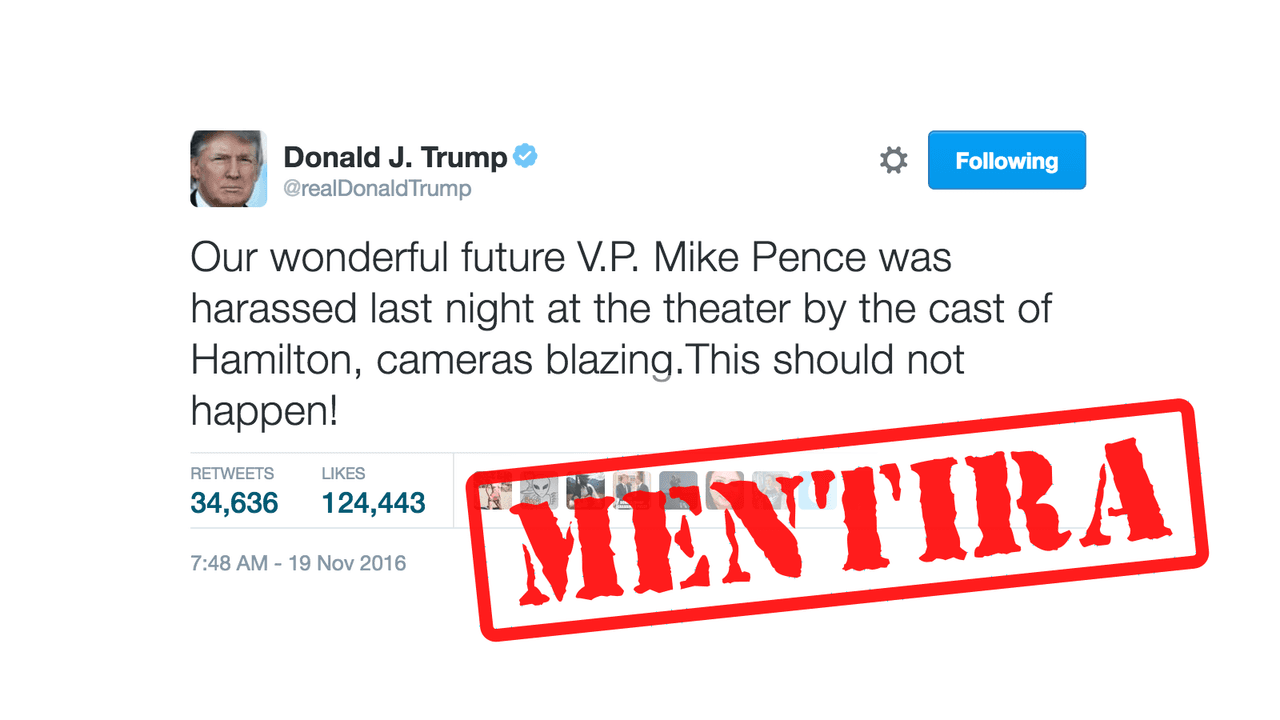 Las acusaciones de Trump sobre lo ocurrido durante una presentación de la obra teatral Hamilton son subjetivas. Sin embargo, el propio Vicepresidente electo Mike Pence fue quien dejó en evidencia las falsedades y exageraciones que lanzó su jefe.