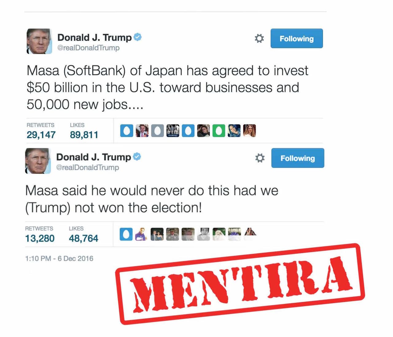 “Masa (SoftBank) de Japón ha aceptado invertir $50 mil millones en Estados Unidos hacia empresas y 50,000 nuevos empleos… Masa dijo que él nunca hubiera hecho esto si nosotros (Trump) no hubiéramos ganado la elección”