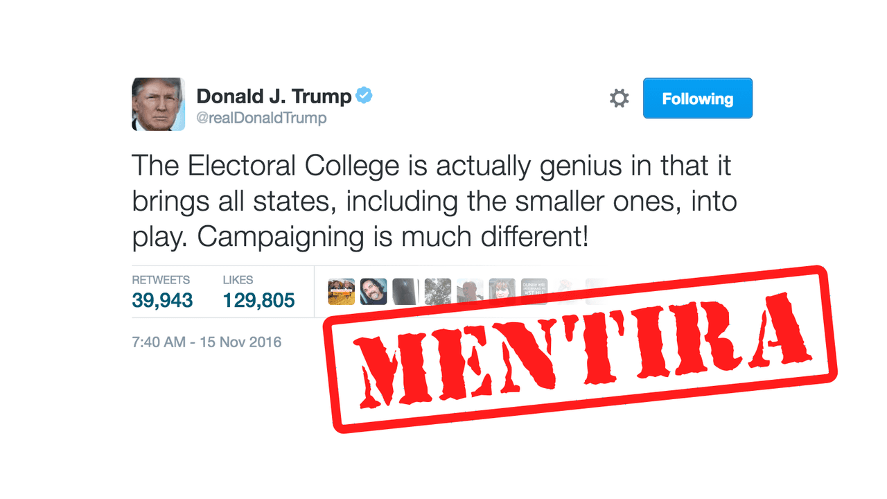 Tal afirmación ya la analizamos y la consideramos mentira. El Colegio Electoral hace lo contrario a lo que dice Trump: limita la relevancia electoral a unos pocos estados en donde no están claras las preferencias de los votantes, al tiempo que más de 30 estados, ampliamente demócratas o ampliamente republicanos, son menospreciados durante las campañas presidenciales.