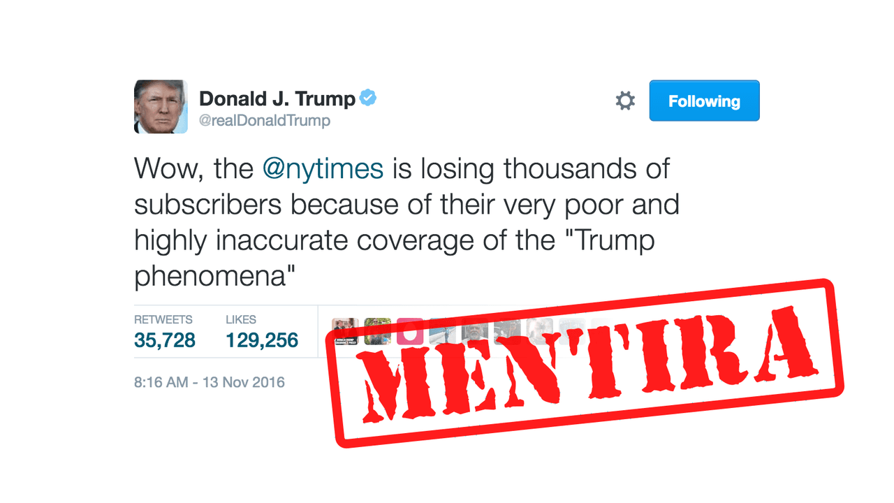 “Wow, el @NYTimes está perdiendo miles de suscriptores debido a su muy pobre y altamente imprecisa cobertura del “fenómeno Trump”