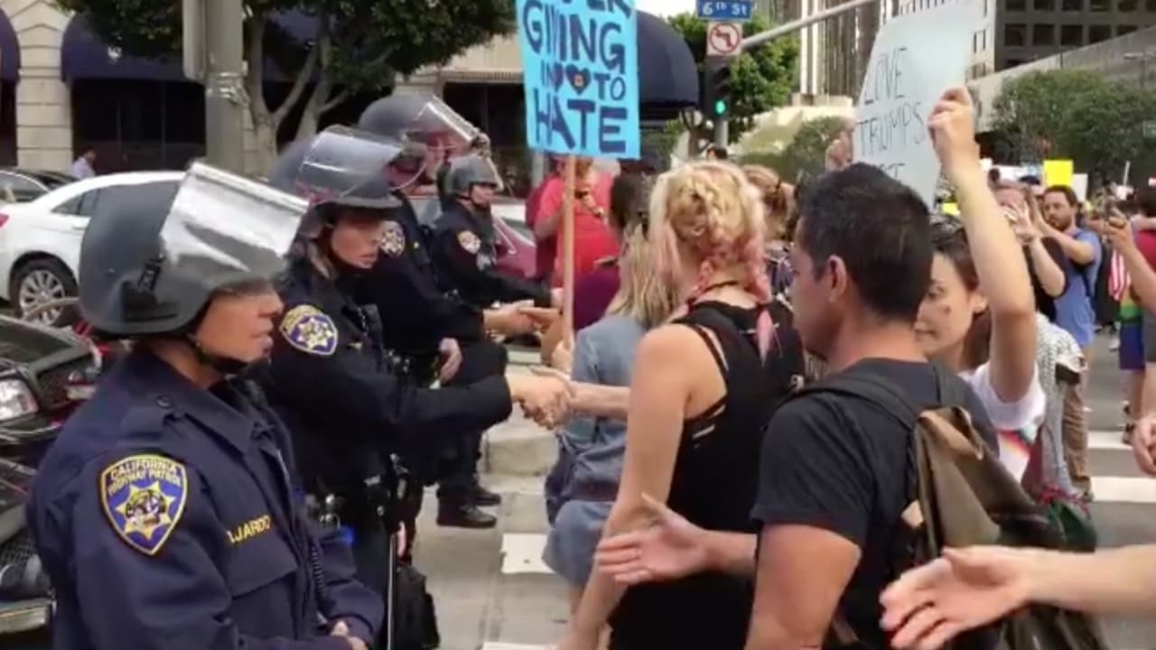 Los manifestantes anti-Trump agradecen a la policía y el video se hace viral