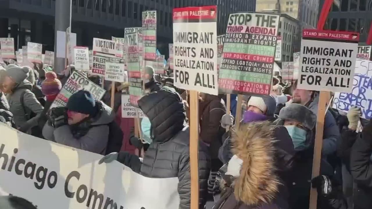 Inmigrantes salieron a las calles de Chicago este lunes para manifestarse en contra del plan de deportaciones masivas de Donald Trump, el mismo día en el que el republicano asumió su cargo como presidente.