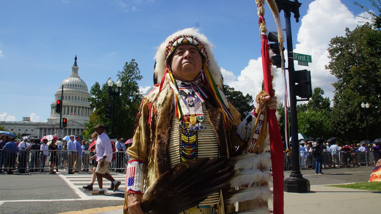 Un poco más allá, el líder indio sioux Glynn Crooks mostraba los fastos de su indumentaria coronada con 38 plumas de águila dorada y el bastón de mando emplumado que representa a la Nación Dakota.