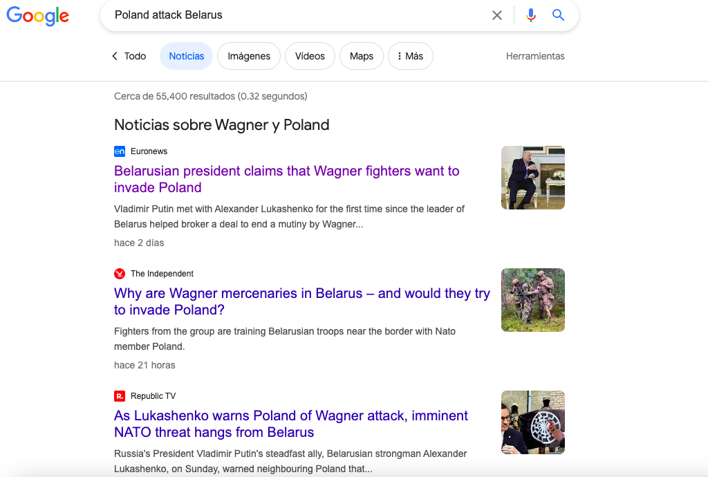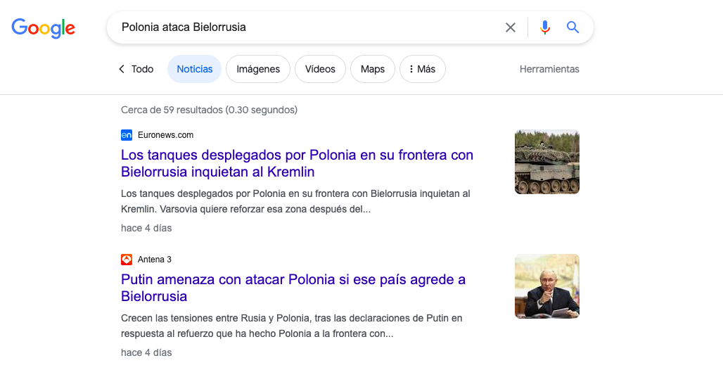 En elDetector hicimos búsquedas por palabras clave (en inglés y en español) en la sección de noticias de Google y no encontramos información sobre ningún ataque de Polonia a Bielorrusia (si realmente hubiera ocurrido se habría replicado en medios, dadas las implicaciones internacionales de que un país miembro de la OTAN, como Polonia, se estuviera enfrentando con un aliado de Rusia, como Bielorrusia).