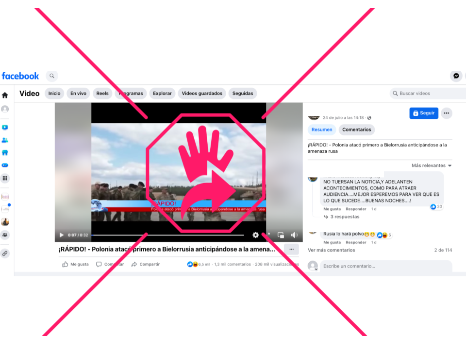 El título de un video publicado el 24 de julio de 2023 en Facebook asegura falsamente que “Polonia atacó primero a Bielorrusia anticipándose a la amenaza rusa”. Sin embargo, se trata de un caso de clickbait (en el que se usa un texto sensacionalista para atraer a los usuarios y lograr más visualizaciones), pues ni en la misma grabación se sustenta tal afirmación y para la fecha de publicación de esta verificación no se ha producido ningún ataque, aunque sí ha habido amenazas y un aumento de la tensión entre ambos países.