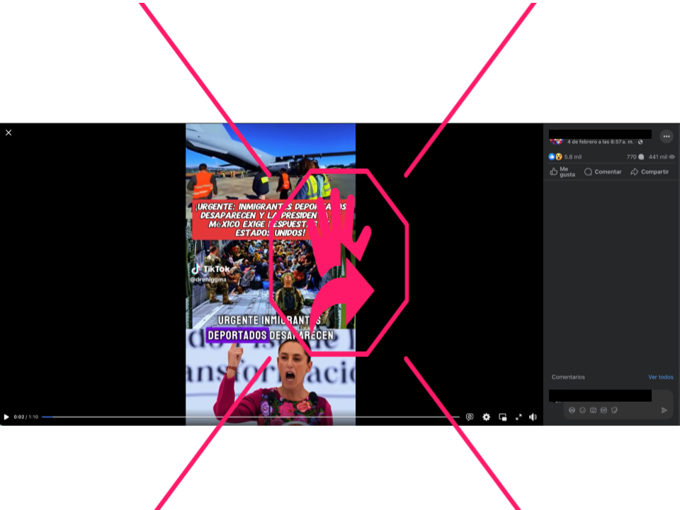 “¡Urgente: Inmigrantes deportados desaparecen y la presidenta de México exige respuestas de Estados Unidos!”, dice un mensaje sobrepuesto a un video compartido en Facebook cuya portada muestra una fotografía de un aeropuerto, una de decenas de personas a bordo de un avión custodiado por dos militares y otra de Sheinbaum usando un vestido color rosa con flores en el pecho.