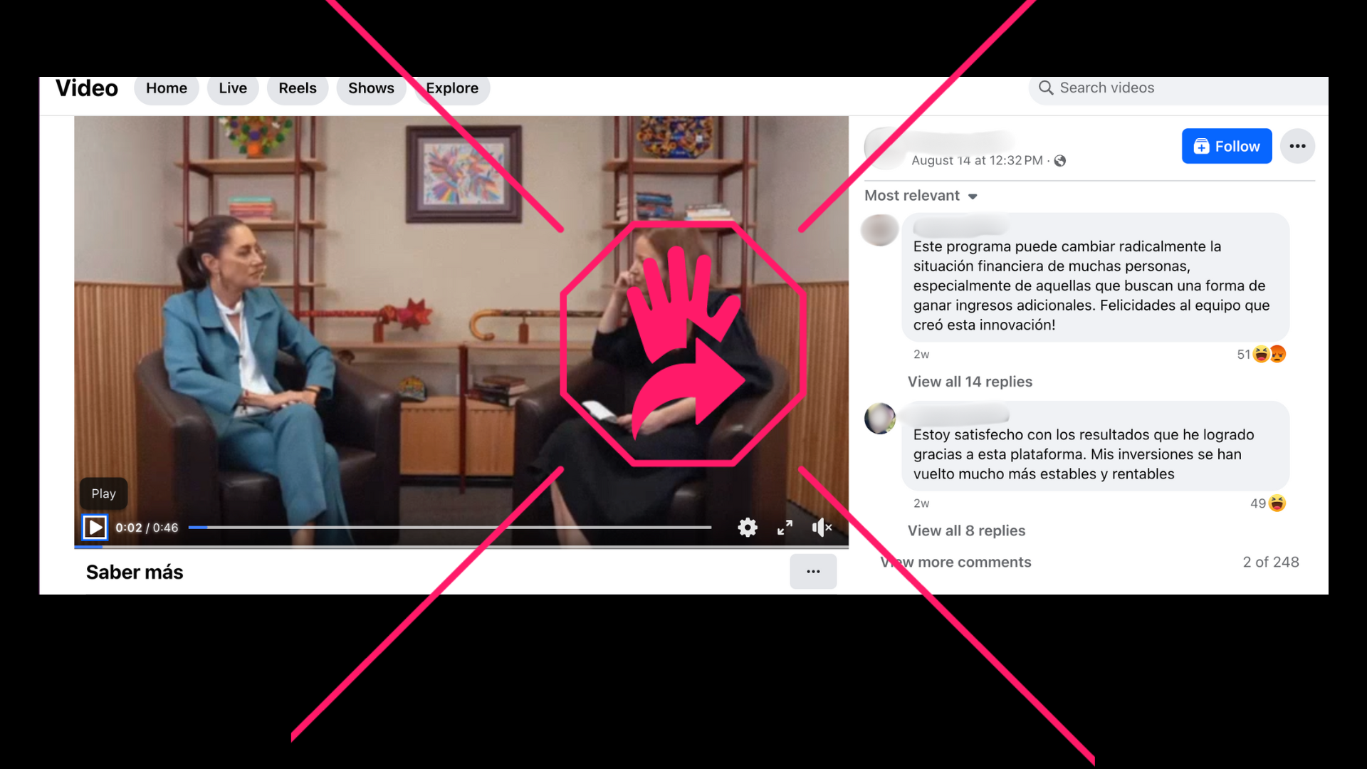 En el video se escucha a Sheinbaum responder, supuestamente, a Inna Afinogenova, a quien en un artículo de The Washington Post describen como la “principal propagandista de Rusia” en América Latina, que "Pemex es la mejor plataforma de inversión en México" cuando le pregunta si vale la pena invertir en la empresa petrolera. Una voz en off añade que "los principales especialistas se han unido para lanzar una plataforma de inversión que ya ha enriquecido a 100,000 mexicanos".
