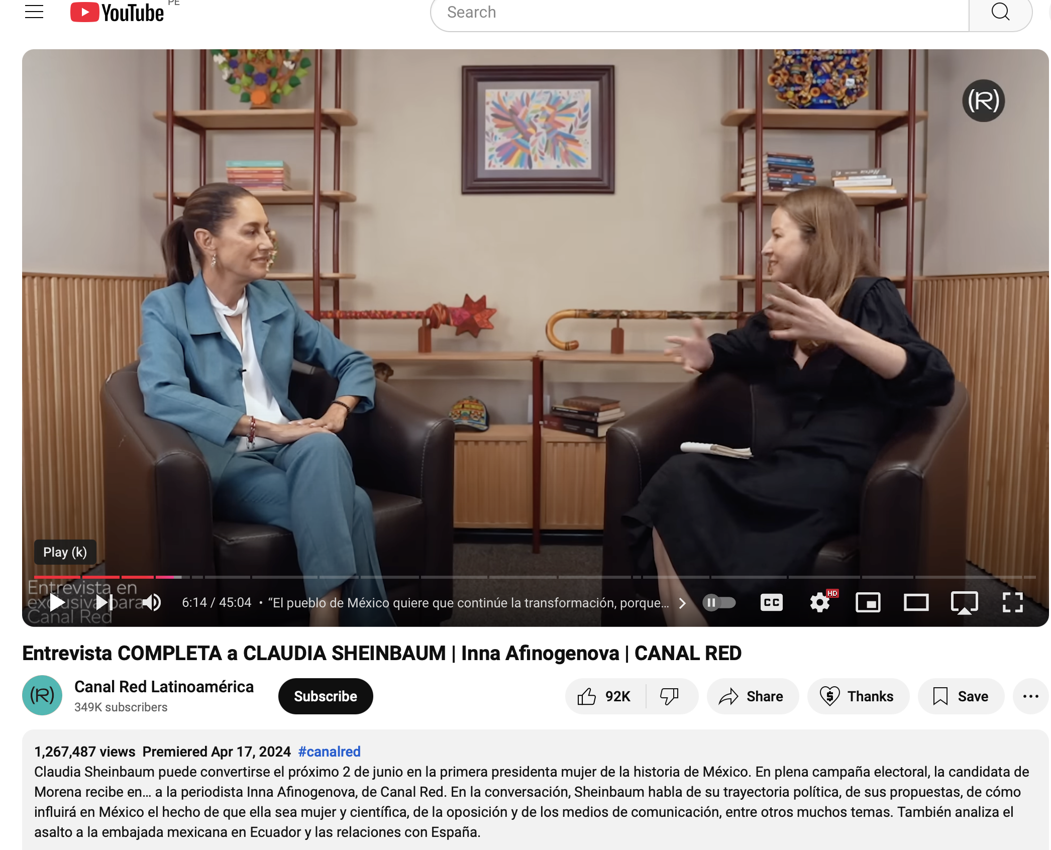 En elDetector realizamos una búsqueda inversa de imágenes usando Google Lens a partir de una captura de pantalla de la grabación y logramos identificar el video original. Al comparar la entrevista, publicada el 17 de abril de 2024 en la cuenta oficial de “Canal Red Latinoaméricana”, con la grabación que circula en Facebook, notamos que la vestimenta de Sheinbaum y la de la entrevistadora, así como el escenario, son los mismos en ambas versiones.