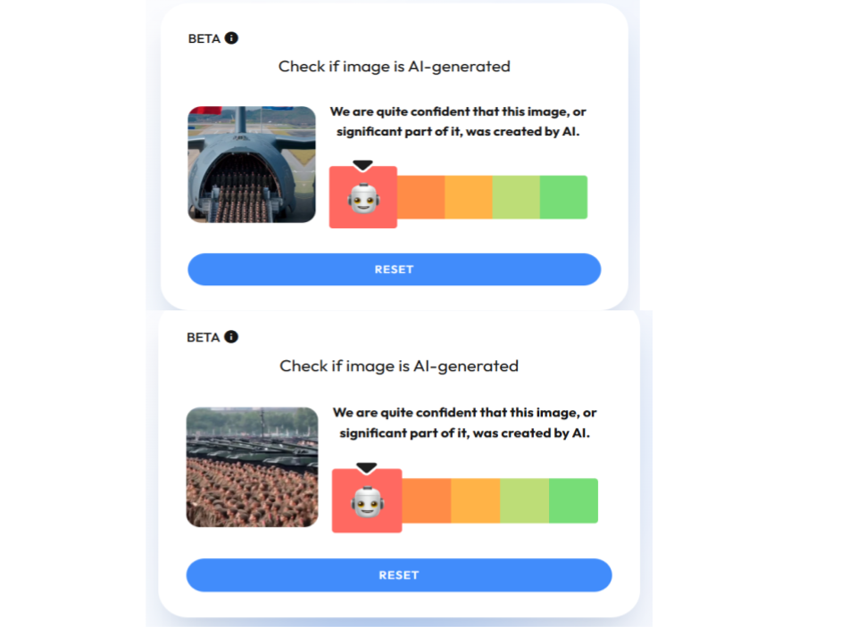 Con dos diferentes herramientas de detección de IA: WasitAI y AI Detector online, comprobamos que los clips de apoyo son una creación digital.