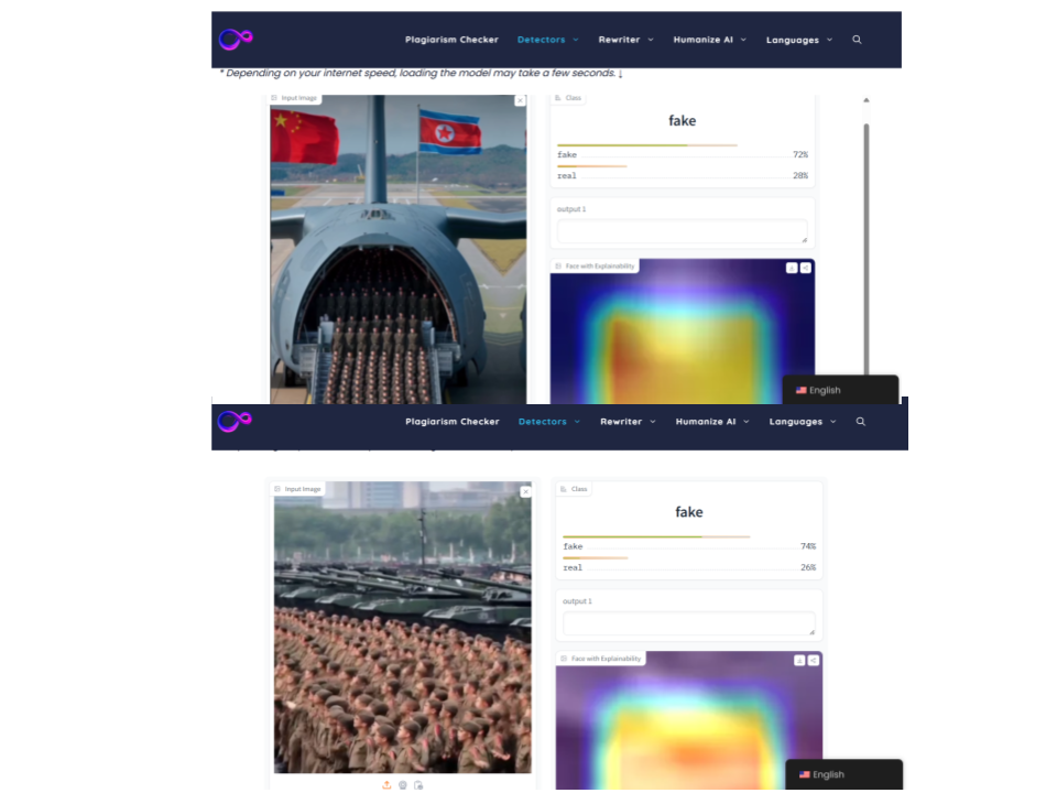 Analizamos dos capturas de pantalla de los clips de video y WasitAI determinó, en el caso de un avión tipo militar con la bandera de China a la izquierda de la imagen y la de Corea del Norte a la derecha de la imagen, en el que se ve ingresando a supuestos militares; y la imagen de un supuesto desfile militar y tanques de guerra de fondo, que ambas son IA. “Estamos bastante seguros de que esta imagen, o una parte significativa de ella, fue creada por IA”, se lee en el resultado.