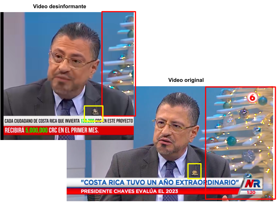Mediante una búsqueda inversa de imagen en Google, en elDetector encontramos que la presentadora que aparece en el video desinformante en el que se ve a Chaves trabaja en Noticias Repretel, así que buscamos el nombre del mandatario en el sitio web de ese noticiero y encontramos que la grabación original (él está con la misma vestimenta, el mismo pin y decoración navideña de fondo) data del 28 de diciembre de 2023 y que en ella Chaves habló sobre temas de la actualidad costarricense, asuntos relacionados con la composición de su gobierno y con los objetivos que tiene para su periodo al frente del país, sin promocionar la supuesta plataforma de inversión Quantum AI.