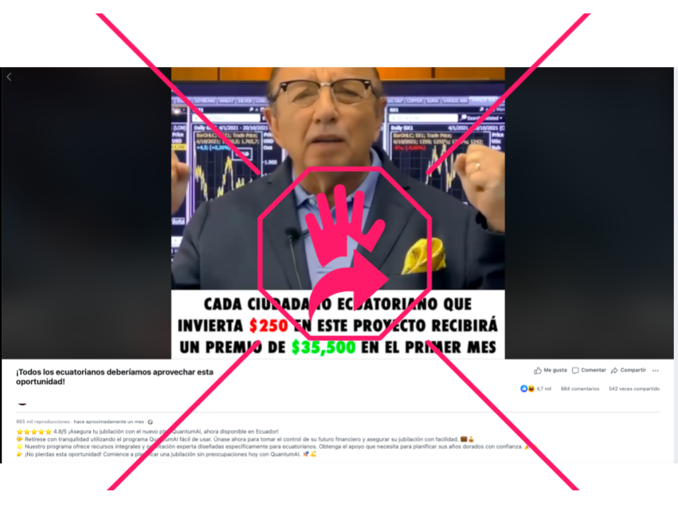 En enero de 2024, en elDetector desmentimos que el presidente del gobierno español promoviera durante una entrevista la misma plataforma Quantum AI. En ese caso, también había sido manipulado un video de Pedro Sánchez para tratar de hacer ver que decía las mismas palabras que se ponen en boca de Chaves y Noboa en las publicaciones que estamos verificando: que ellos mismos probaron la plataforma de inversión y lograron ganancias, que agradecen a Elon Musk (quien también ha sido asociado falsamente con Quantum AI) por supuestamente elegir a su país “como el primero en el que funcionará esta aplicación” y que “en una o dos semanas se cerrará la inscripción para siempre” por la supuesta enorme cantidad de solicitudes.