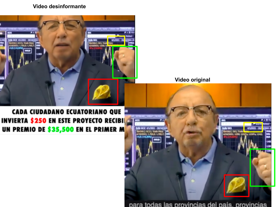 El audio de ambos videos, así como los labios de Chaves, Noboa y las periodistas que también aparecen en las grabaciones, fueron alterados para poner en sus bocas palabras que no pronunciaron, una técnica de desinformación conocida como deepfake, en la que se emplea la tecnología para crear imágenes falsas pero realistas.