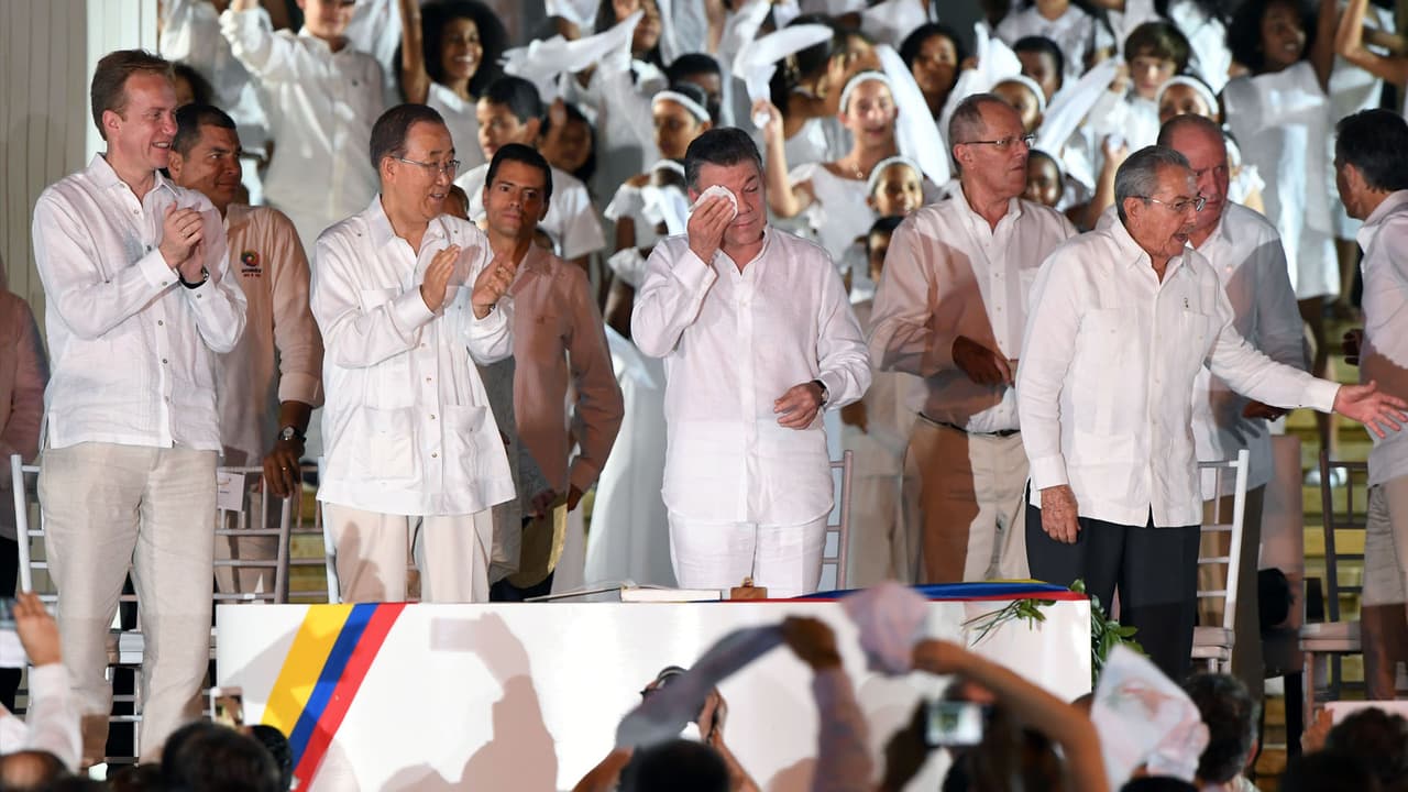 Además de ellos, fueron testigos de la firma del acuerdo, entre otros, el rey Juan Carlos I y el expresidente del Gobierno español Felipe González; los presidentes de México, Enrique Peña Nieto; Perú, Pedro Pablo Kuczynski, y de Guatemala, Jimmy Morales, y el secretario de Estado de EEUU, John Kerry.