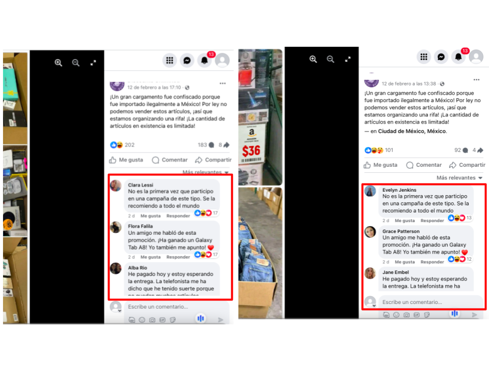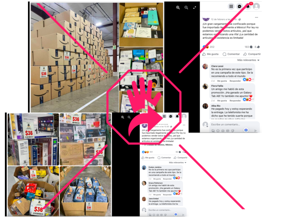 “¡Un gran cargamento fue confiscado porque fue importado ilegalmente a México! Por ley no podemos vender estos artículos, ¡así que estamos organizando una rifa! ¡La cantidad de artículos en existencia es limitada!”, dice el texto que acompaña las imágenes, en las que se ven etiquetas con el logo de Amazon y el valor de “$36”. Las publicaciones fueron difundidas el 12 de febrero de 2024 y tres días después acumulaban decenas de reacciones y comentarios.
