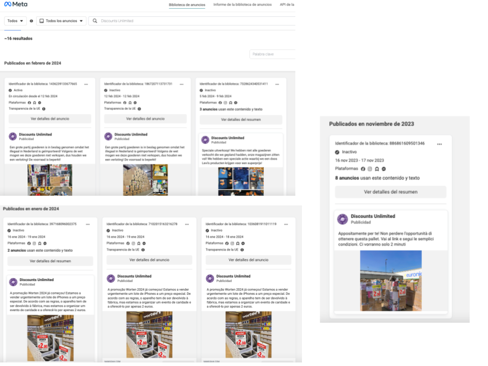 Asimismo, al revisar la sección de anuncios de la cuenta de Facebook desde la que fueron publicados los posts encontramos publicaciones similares hechas desde noviembre de 2023 en distintos idiomas en las que se ofrecen, por ejemplo, supuestos iPhones a 2 euros como parte de un “evento de caridad” de las tiendas europeas Worten (con almacenes en Portugal y España). Además, ninguno de los administradores de ese perfil está en los países que se mencionan en las publicaciones (México y Holanda), sino en Vietnam, Canadá, Filipinas y Ucrania.