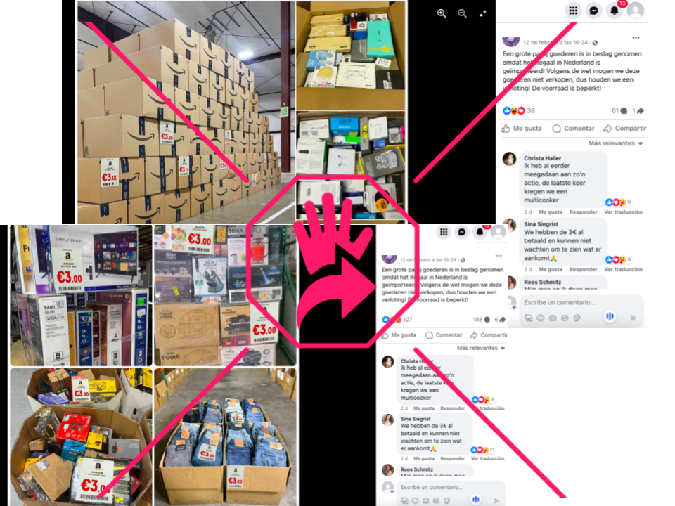 Publicaciones en Facebook en las que se ven cajas cerradas con el logo de Amazon y otras abiertas con productos de todo tipo dentro (como artículos tecnológicos, herramientas o ropa) aseguran que se trata de un cargamento que “fue confiscado porque fue importado ilegalmente a México” y que los productos están siendo rifados, a cambio de un aporte de 36 pesos (2.11 dólares), porque legalmente no se pueden vender. Sin embargo, todo lo anterior es falso: desde la cuenta que publica estos posts también han sido difundidas las mismas imágenes con un texto en holandés que asegura que el supuesto decomiso se produjo en Países Bajos y, en ese caso, las etiquetas —añadidas digitalmente a las fotos— marcan un valor de 3 euros. Además, el gigante del comercio electrónico dijo a elDetector que no sortea productos de esa manera.