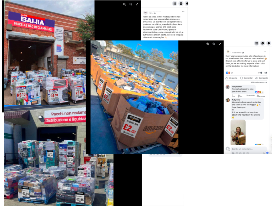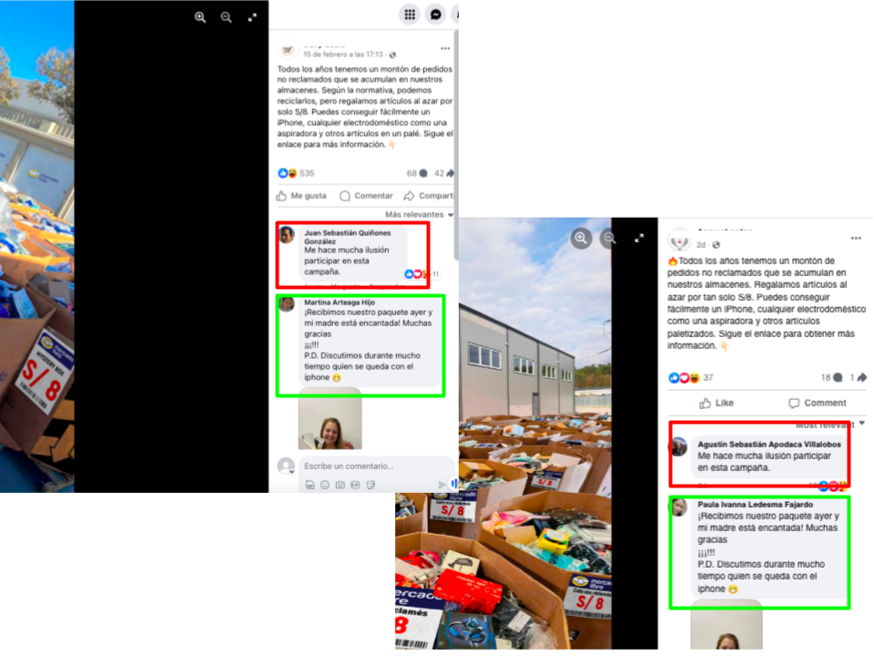 “Todos los años tenemos un montón de pedidos no reclamados que se acumulan en nuestros almacenes. Según la normativa, podemos reciclarlos, pero regalamos artículos al azar por solo S/8. Puedes conseguir fácilmente un iPhone, cualquier electrodoméstico como una aspiradora y otros artículos en un palé. Sigue el enlace para más información”, dicen varias publicaciones difundidas en la red social en febrero de 2024 y que sumaban centenares de reacciones.
