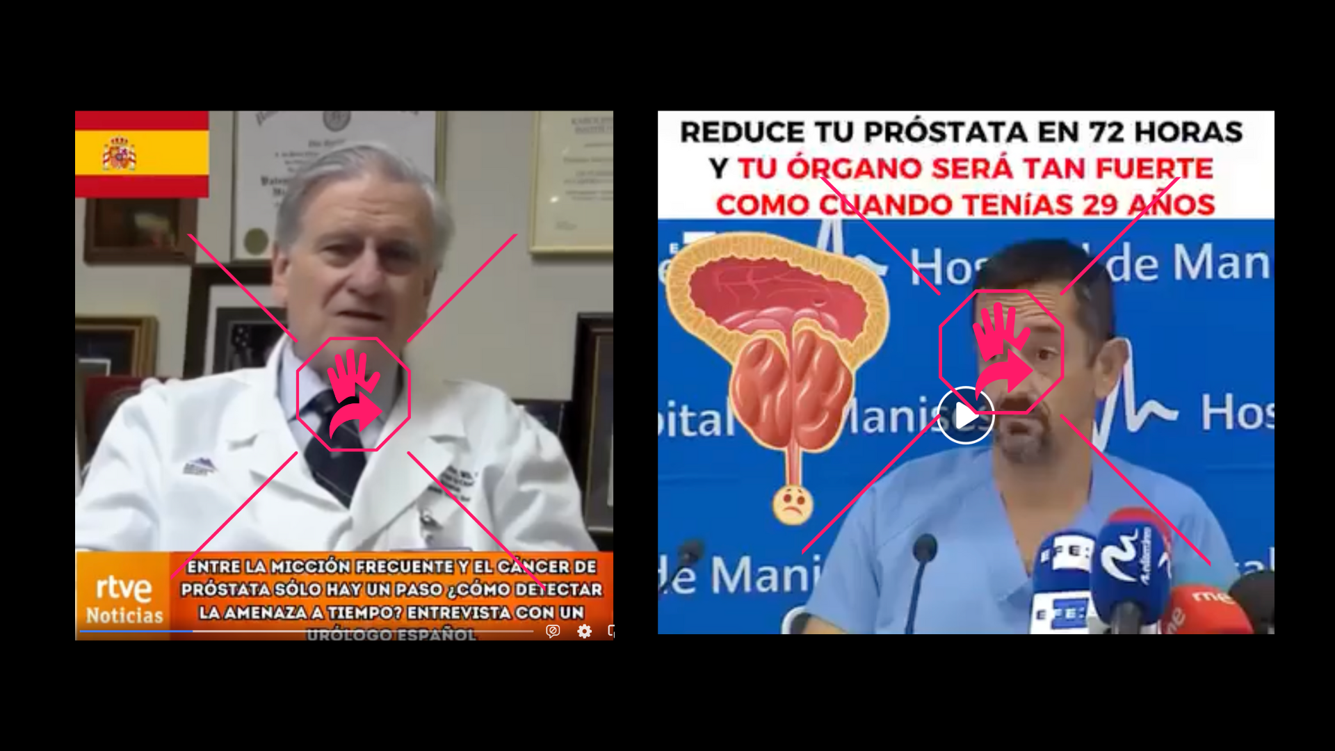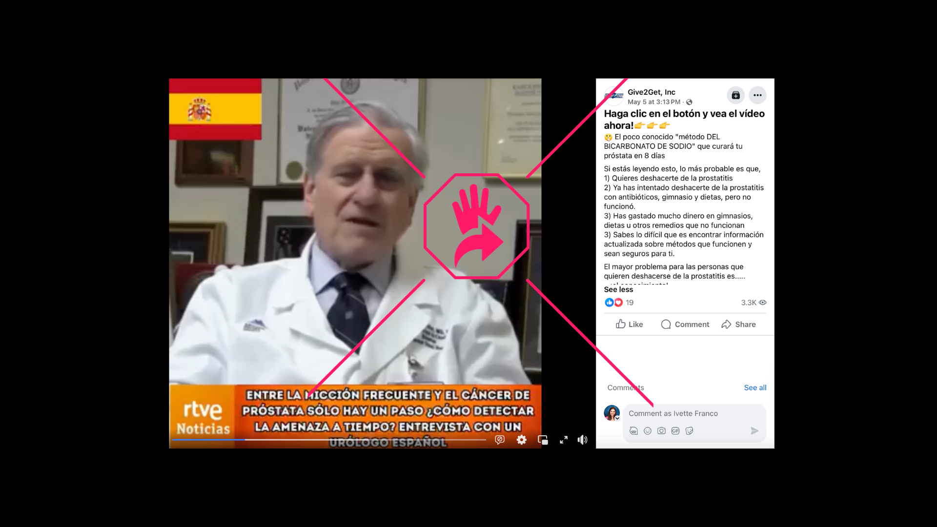 Otro post, con el mismo mensaje que promete curar la prostatitis en ocho días con bicarbonato de sodio, incluye un video en el que el médico español Valentín Fuster aparentemente asegura que “el medicamento que no quieren vender en nuestras farmacias elimina la verdadera causa de la infección", refiriéndose a la prostatitis. Pero tampoco el audio de ese clip coincide con el movimiento de los labios del cardiólogo. En la esquina superior izquierda se observa la bandera de España y en la inferior, el logo de RTVE (Radio Televisión Española).
