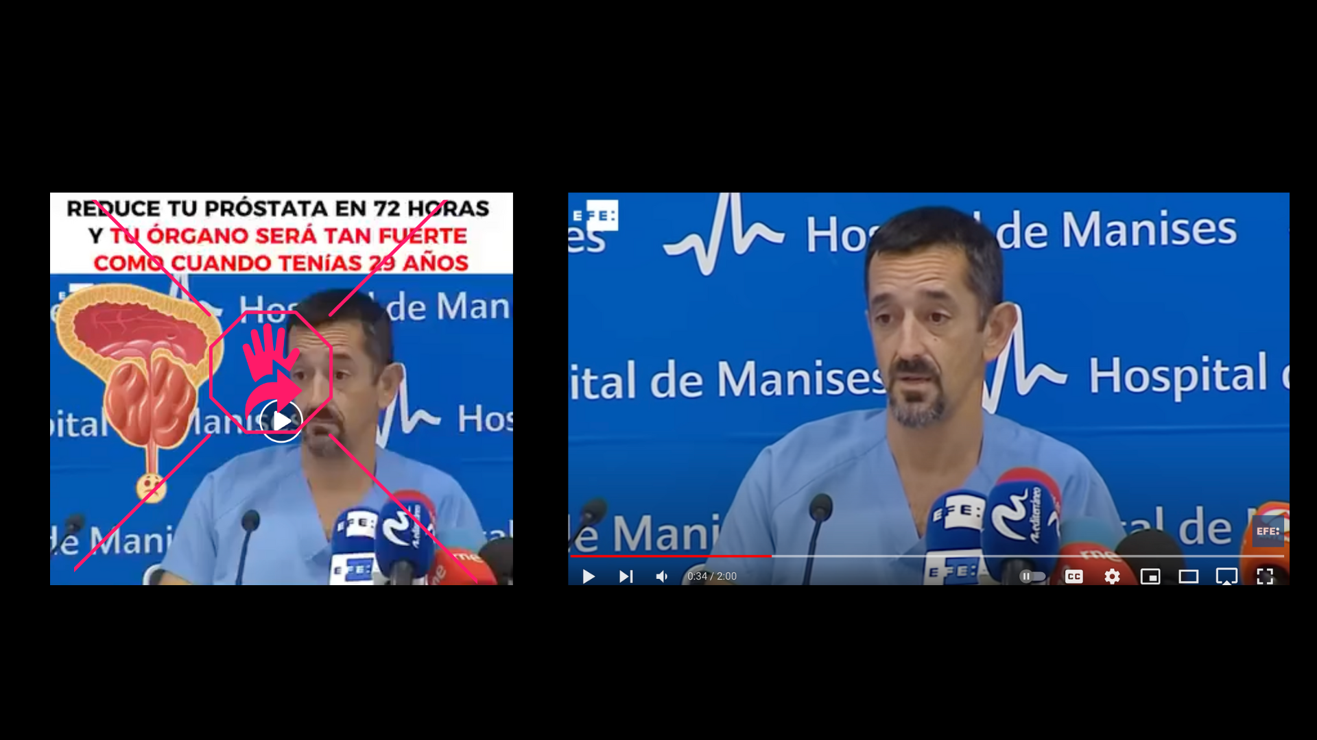 Al compararlo con el post que estamos verificando, notamos que, aunque la vestimenta del cirujano, los micrófonos y el fondo eran idénticos, en ningún momento él hizo mención al bicarbonato ni a la prostatitis. En cambio, habló de un paciente que había sido desahuciado, pero que tras una operación ahora “tiene un futuro”.