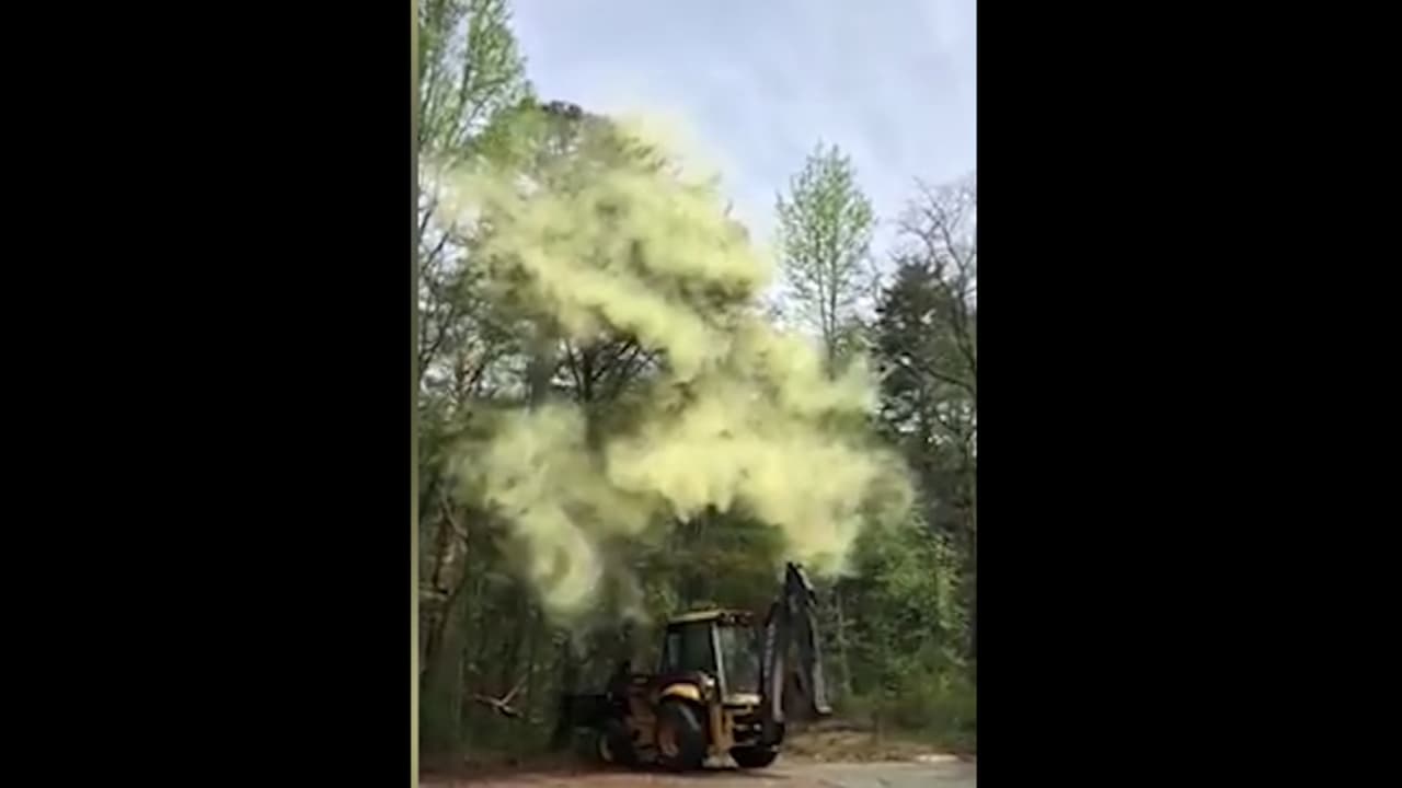Una excavadora golpeó un árbol y casi terminó enterrada entre todo el polen que cayó.